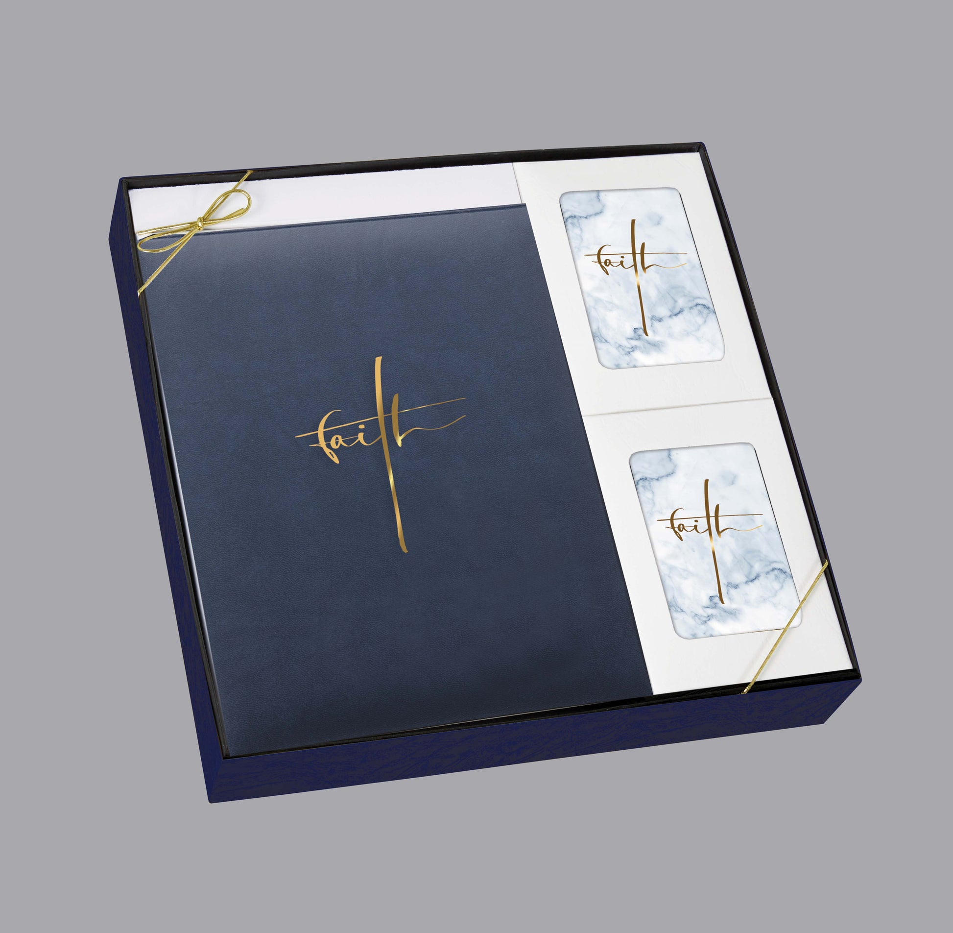 Faith Box Set - Navy Quality two-piece gift box with protective translucent interior cover, finished with coordinating elastic ribbon.